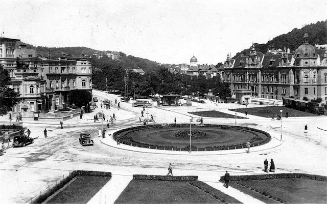 | Anii 1930. Rondoul, intersectia circulara din zona Primariei, care se vede in dreapta imaginii. In stinga se observa Vila Kertsch, in locul careia se afla azi cladirea Modarom. |