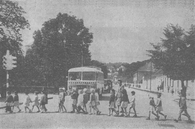 1965. Intersectia de la Ceasu Rau. Se observa cladirea Institutului Proiect. In fata ei plopi. In partea stinga a cadrului se observa un militian linga "borcanul" in care statea in post. Sursa foto: Drum Nou, ed. 27 ianuarie 1965 / Digiteca Arcanum